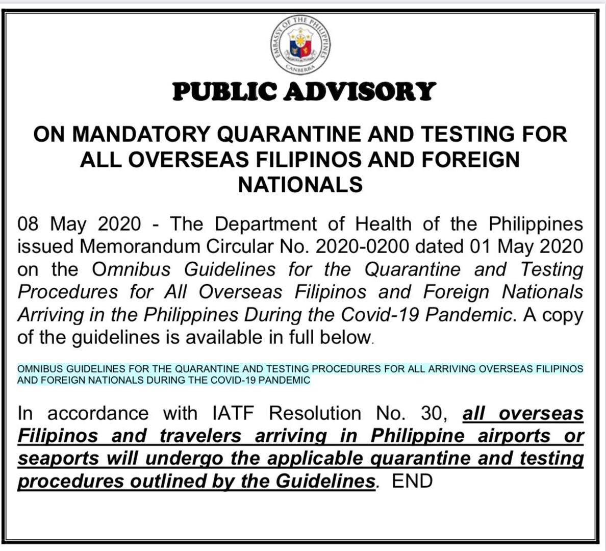Omnibus Guidelines for the Quarantine and Testing Procedures for All Arriving OFs and Foreign Nationals During COVID 19 Pandemic