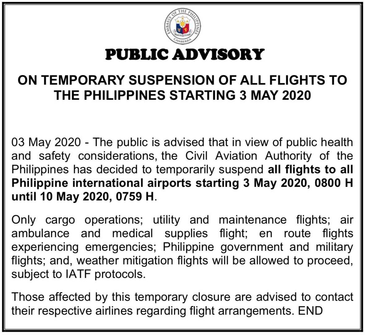 Temporary Suspension of All Flights to the Philippines Starting 3 May 2020
