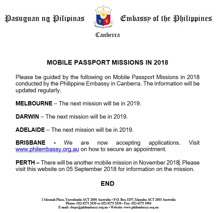 Mobile Consular Mission For Brisbane, Queensland, Australia 10-14 September 2018